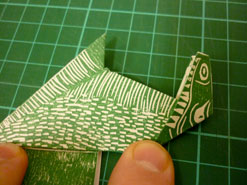 ![]() Crease in the diagonal at the head to allow the reverse fold to reveal the head. |